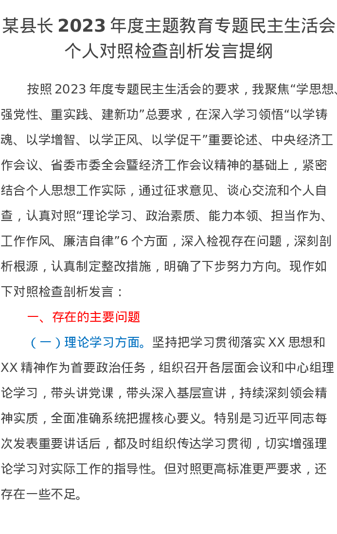 某县长2023年度主题教育专题民主生活会个人对照检查剖析发言提纲(特色社会主义思想)