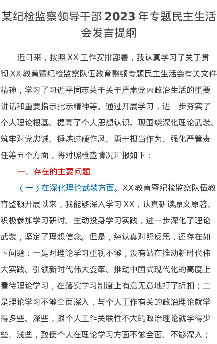 某纪检监察领导干部2023年主题教育暨教育整顿专题民主生活会发言提纲