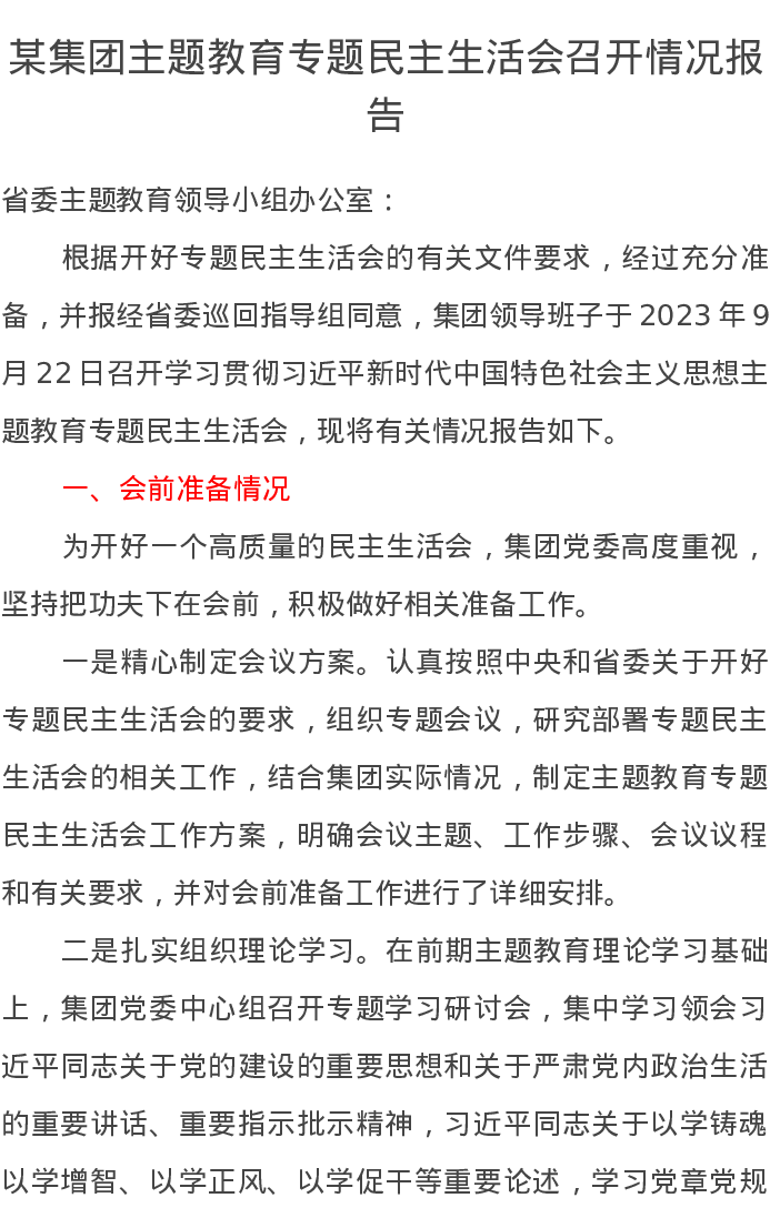 某集团第二批主题教育专题民主生活会召开情况报告(特色社会主义思想)