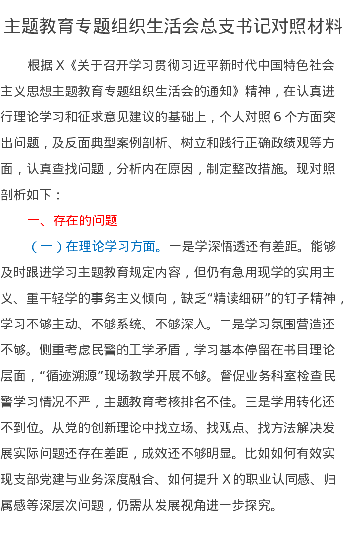 第二批主题教育组织生活会总支书记对照材料(特色社会主义思想)