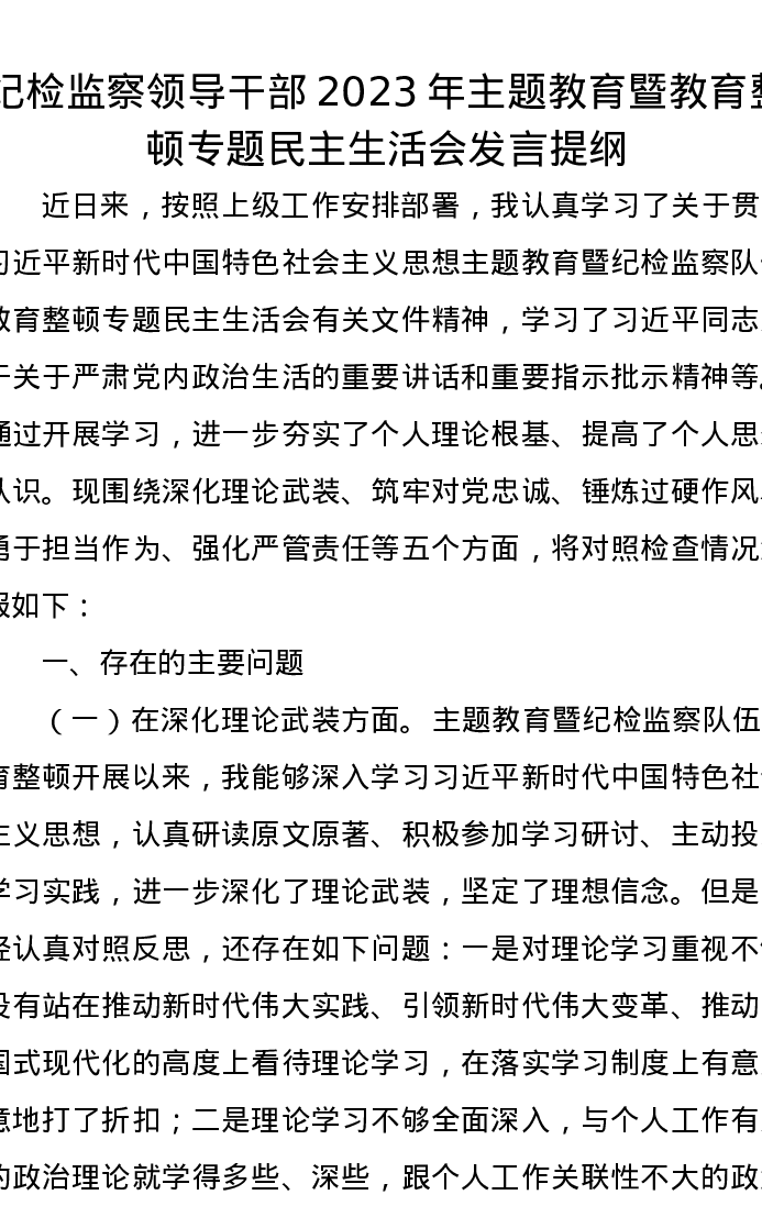 纪检监察领导干部2023年主题教育暨教育整顿专题民主生活会发言提纲