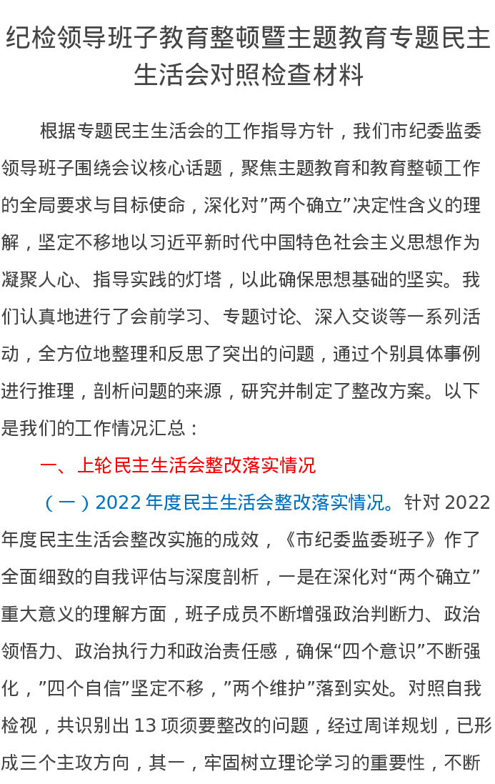 纪检领导班子教育整顿暨主题教育专题民主生活会对照检查材料(特色社会主义思想)