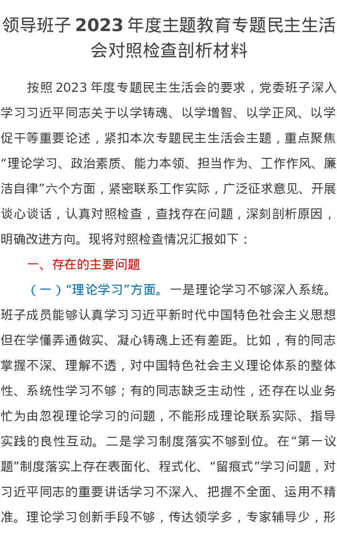 领导班子2023年度第二批主题教育专题民主生活会对照检查剖析材料(特色社会主义思想)