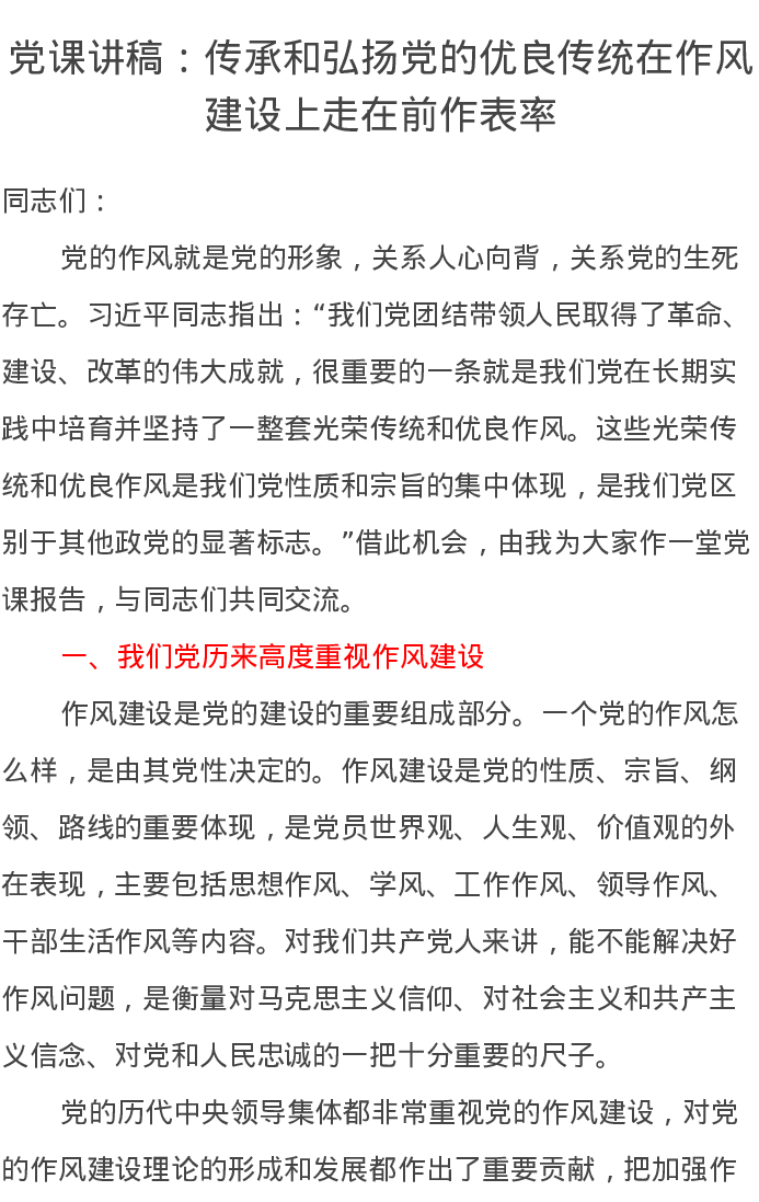 党课讲稿:传承和弘扬党的优良传统在作风建设上走在前作表率