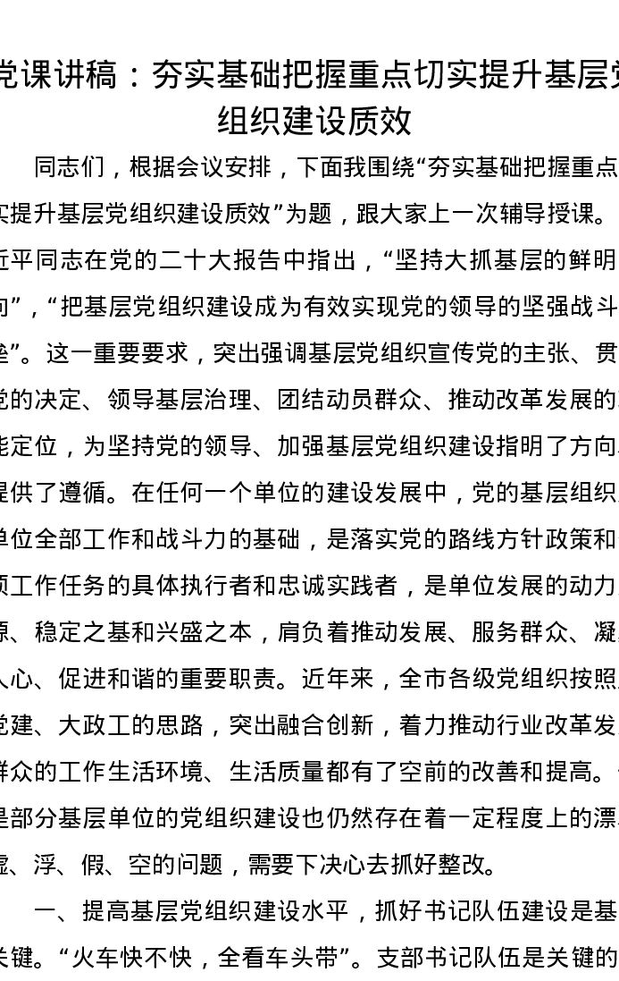 党课讲稿:夯实基础把握重点切实提升基层党组织建设质效