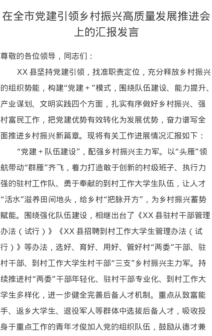 在全市党建引领乡村振兴高质量发展推进会上的汇报发言
