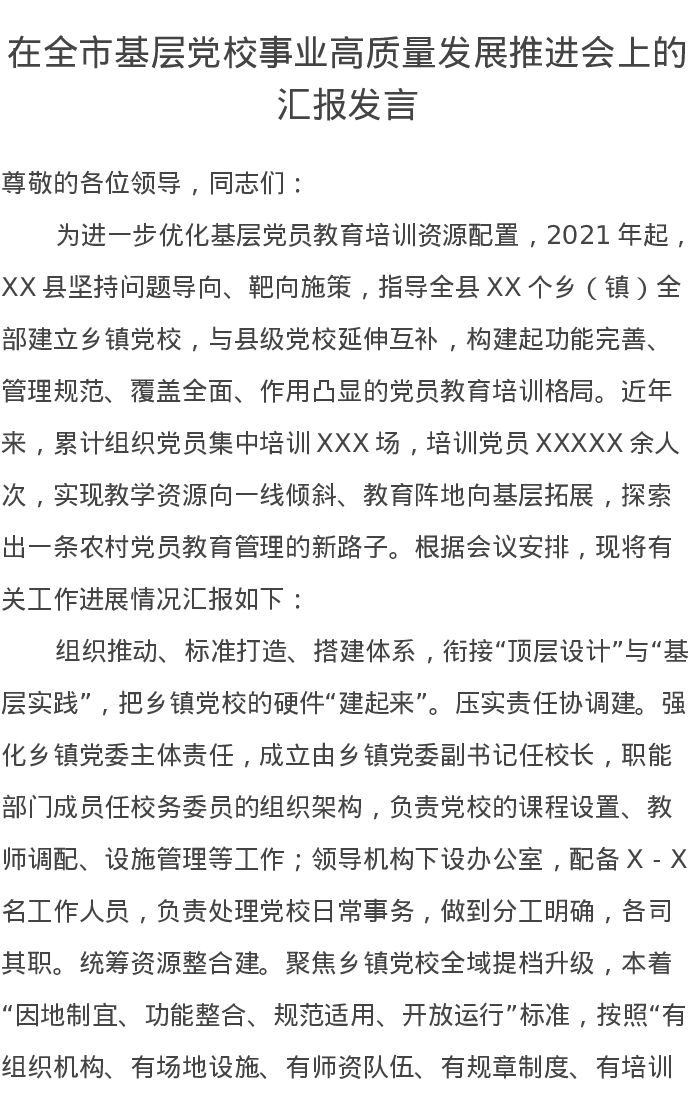 在全市基层党校事业高质量发展推进会上的汇报发言