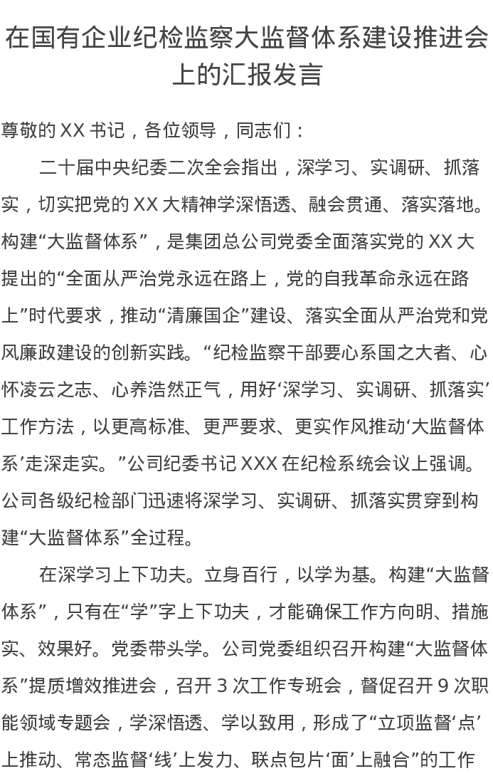 在国有企业纪检监察大监督体系建设推进会上的汇报发言