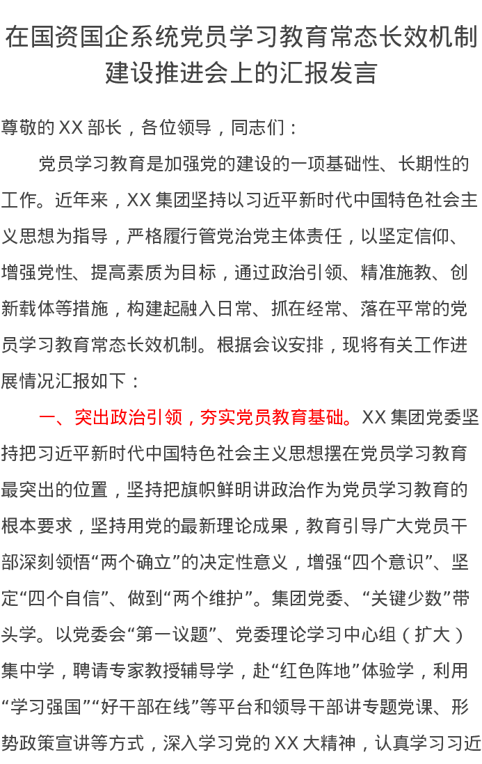 在国资国企系统党员学习教育常态长效机制建设推进会上的汇报发言
