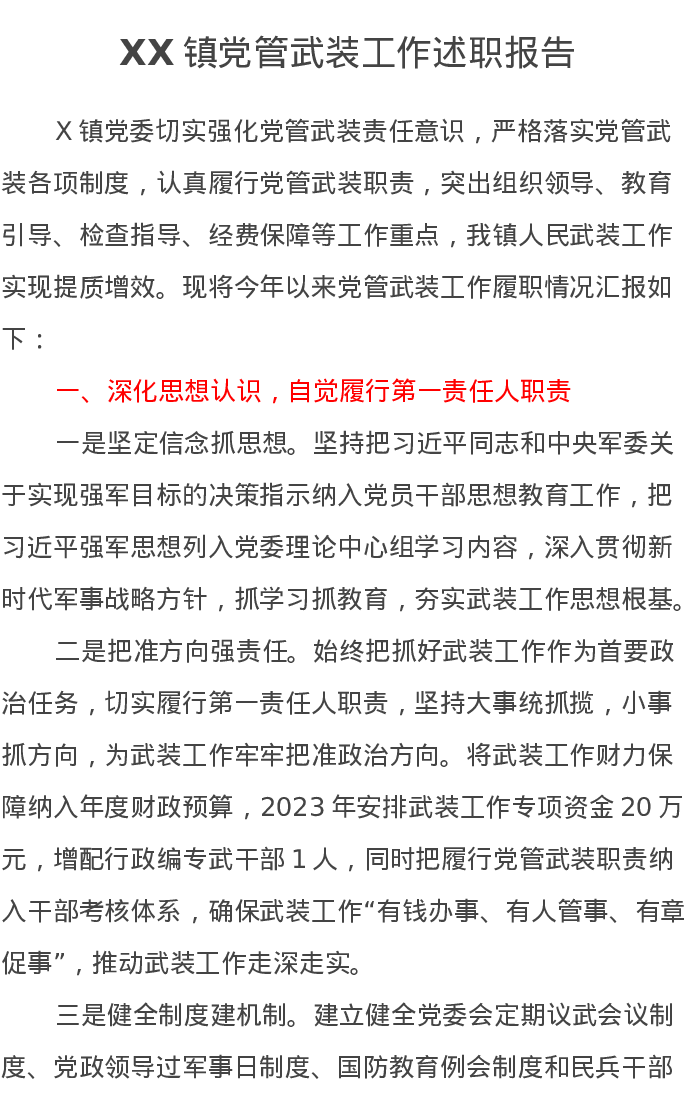 XX镇党管武装工作述职报告