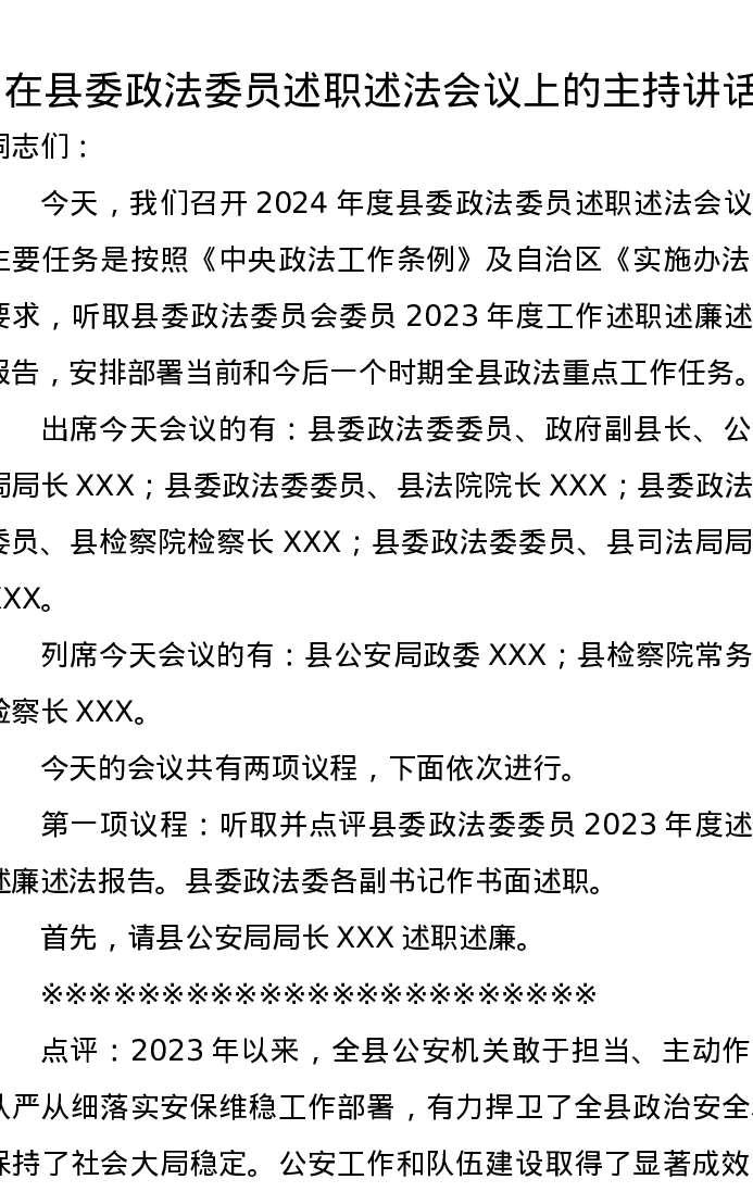 在县委政法委员述职述法会议上的主持讲话