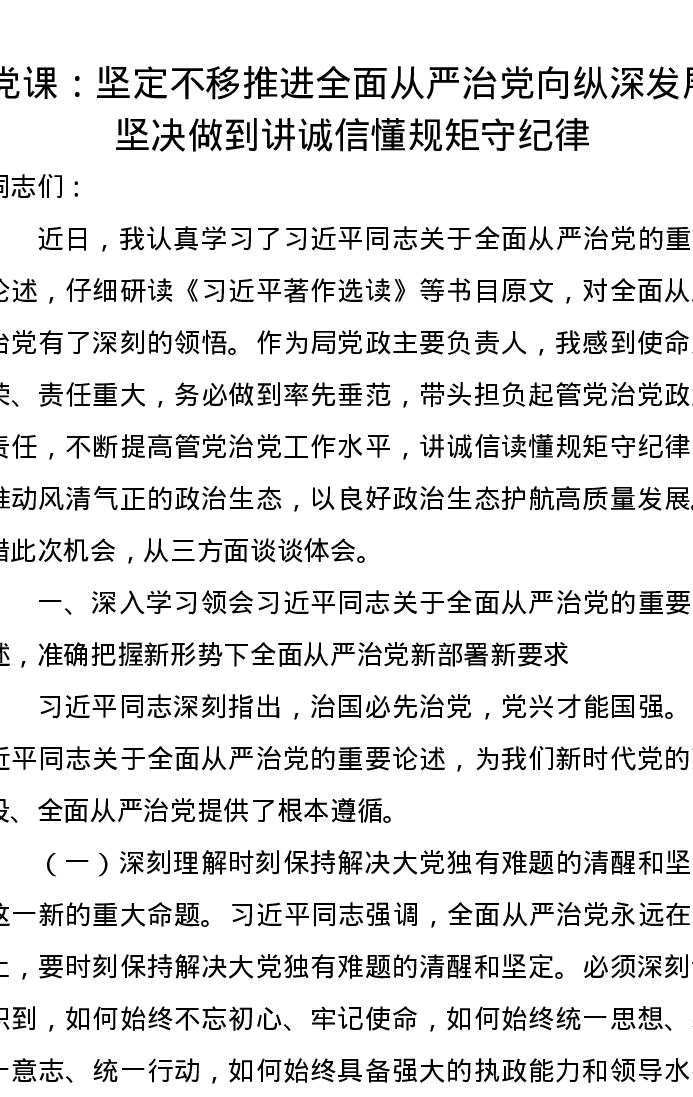 党课讲稿:坚定不移推进全面从严治党向纵深发展坚决做到讲诚信懂规矩守纪律