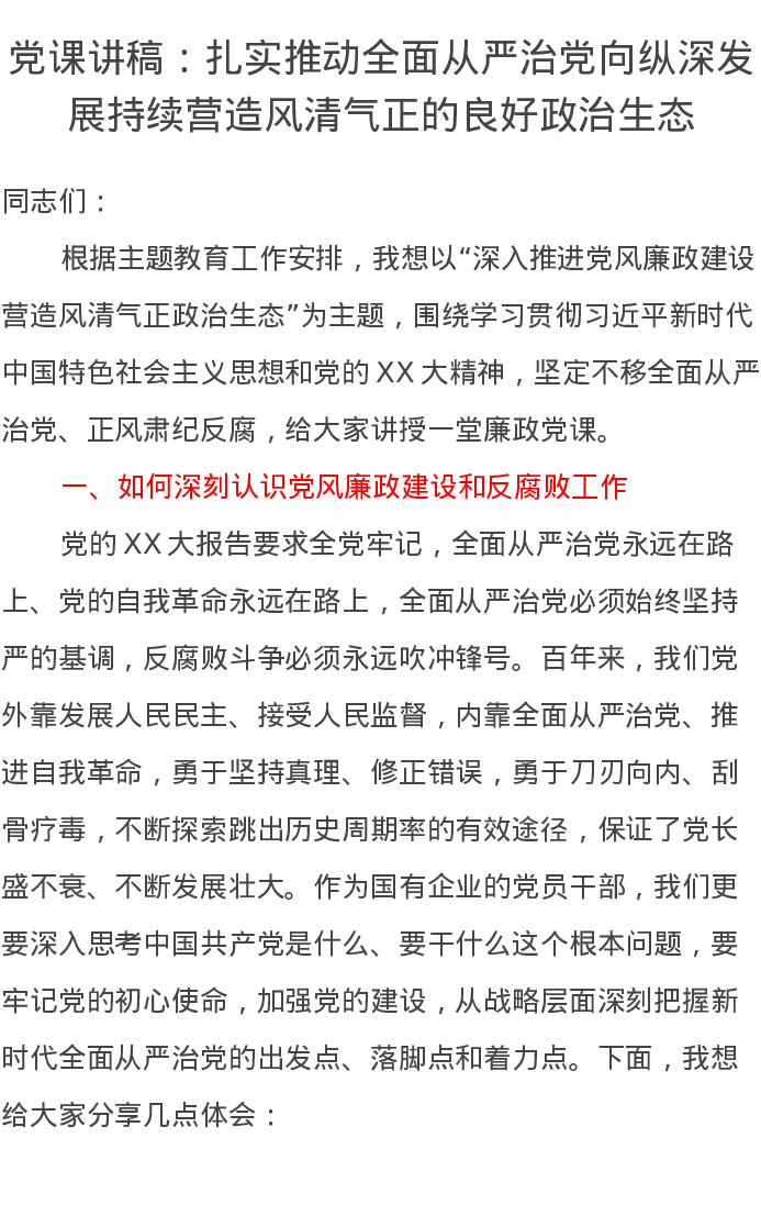 党课讲稿:扎实推动全面从严治党向纵深发展持续营造风清气正的良好政治生态