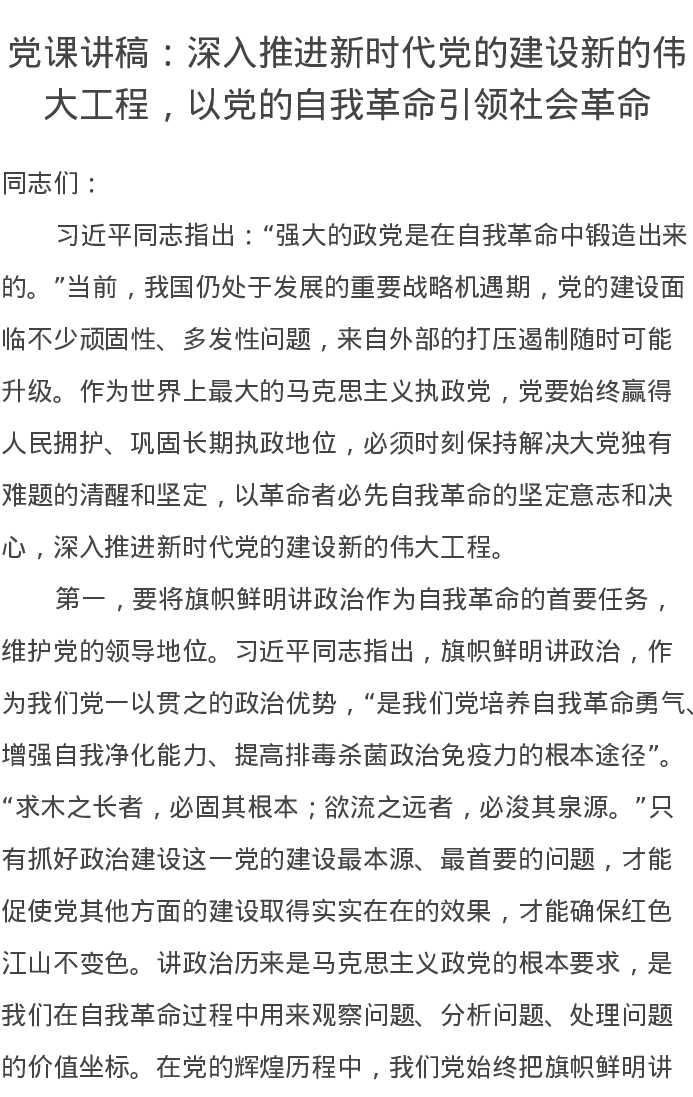 党课讲稿:深入推进新时代党的建设新的伟大工程,以党的自我革命引领社会革命