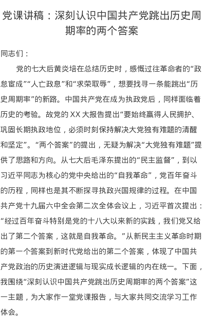 党课讲稿:深刻认识中国共产党跳出历史周期率的两个答案