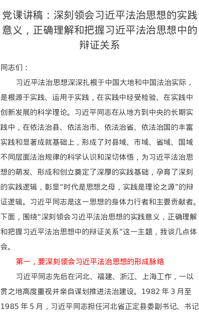 党课讲稿:深刻领会习近平法治思想的实践意义,正确理解和把握习近平法治思想中的辩证关系