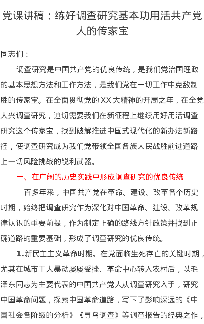 党课讲稿:练好调查研究基本功用活共产党人的传家宝
