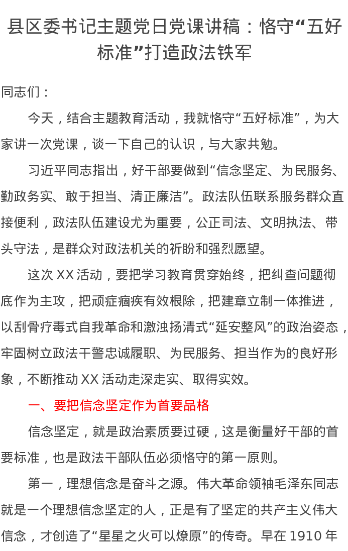 县区委书记主题党日党课讲稿:恪守“五好标准”打造政法铁军
