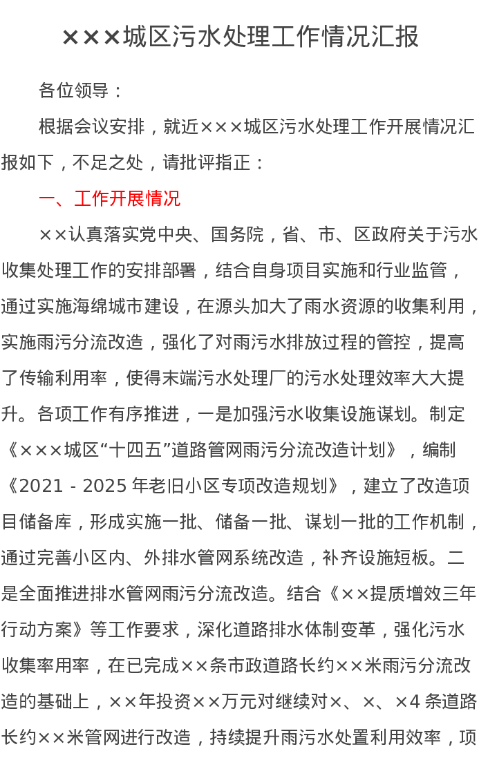 ×××城区污水处理工作情况汇报