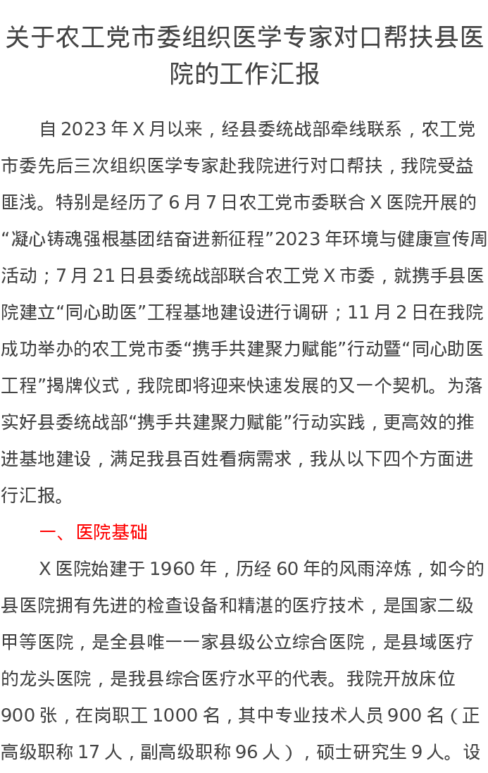 关于农工党市委组织医学专家对口帮扶县医院的工作汇报