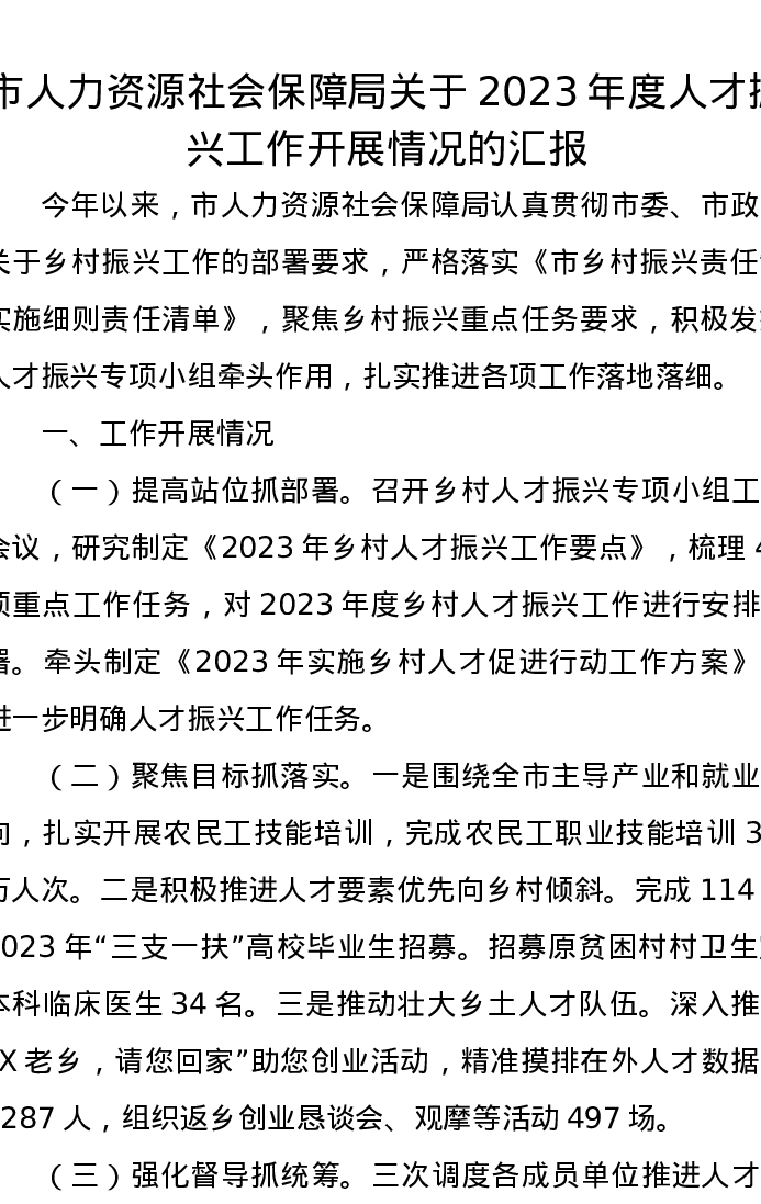 市人力资源社会保障局关于2023年度人才振兴工作开展情况的汇报