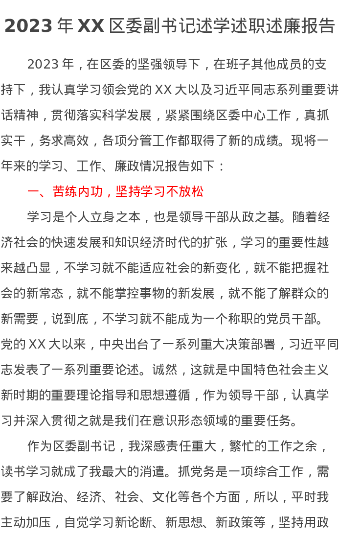 2023年XX区委副书记述学述职述廉报告