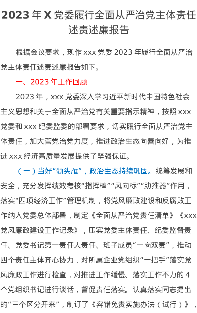 2023年X党委履行全面从严治党主体责任述责述廉报告