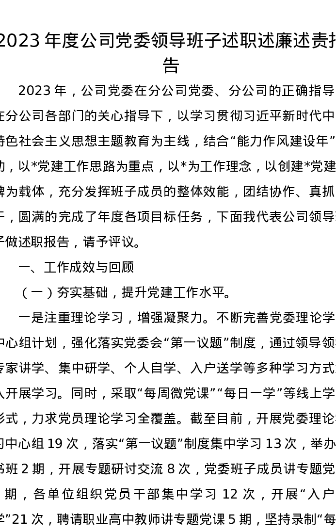 2023年度公司党委领导班子述职述廉述责报告