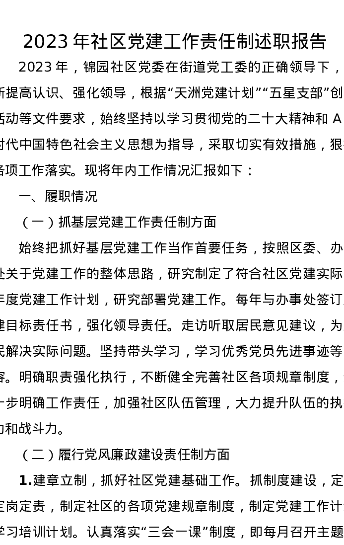 2023年社区党建工作责任制述职报告