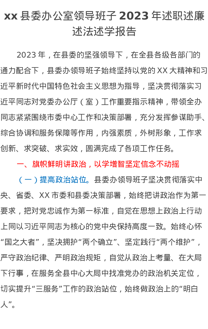 xx县委办公室领导班子2023年述职述廉述法述学报告