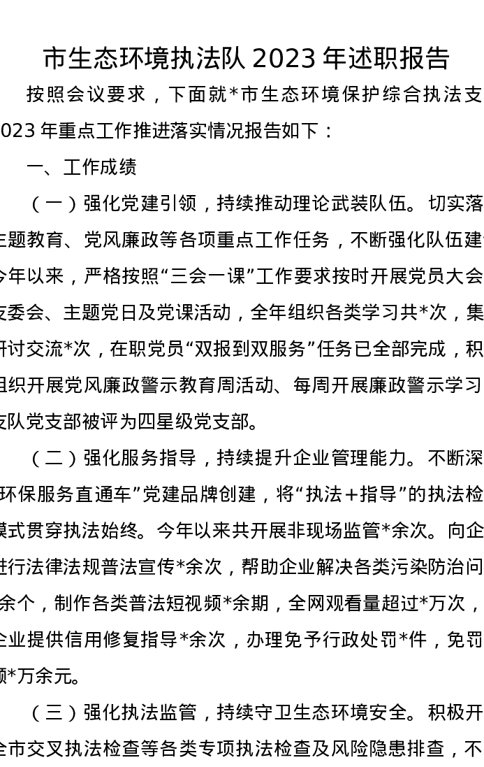 市生态环境执法队2023年述职报告