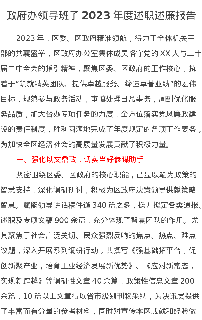 政府办领导班子2023年度述职述廉报告
