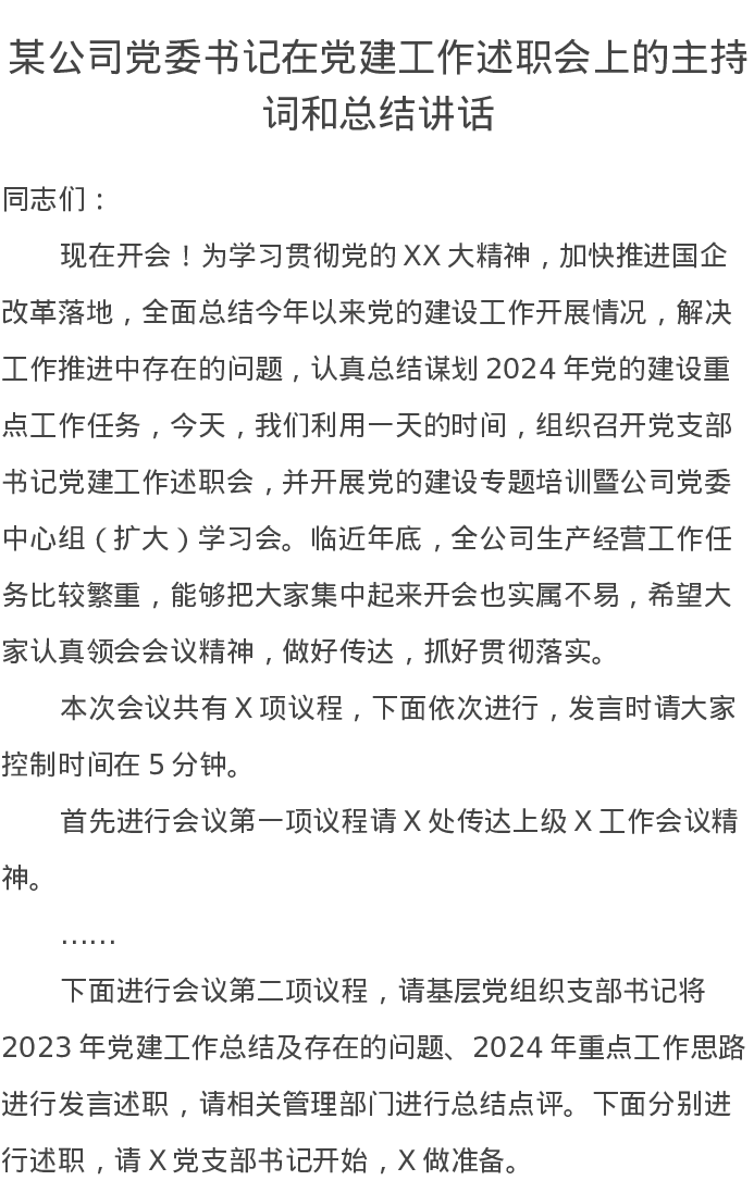 某公司党委书记在党建工作述职会上的主持词和总结讲话