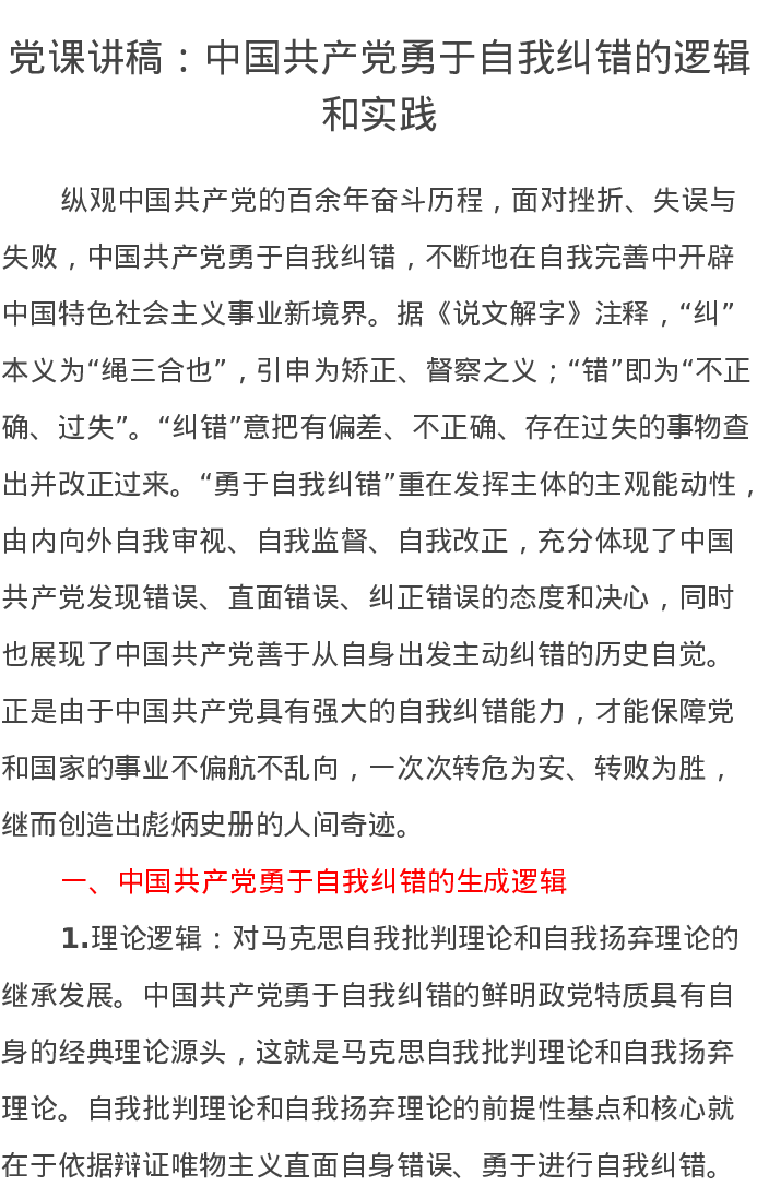 党课讲稿:中国共产党勇于自我纠错的逻辑和实践