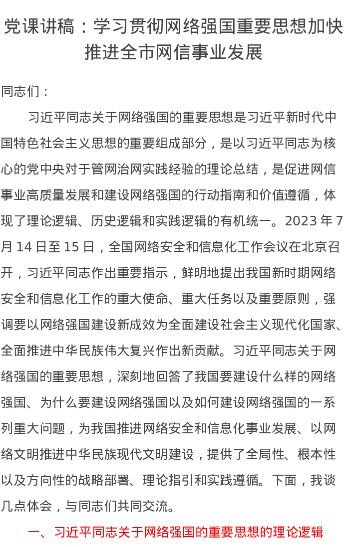 党课讲稿:学习贯彻网络强国重要思想加快推进全市网信事业发展