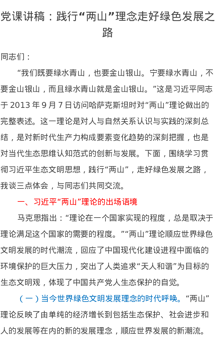 党课讲稿:践行“两山”理念走好绿色发展之路