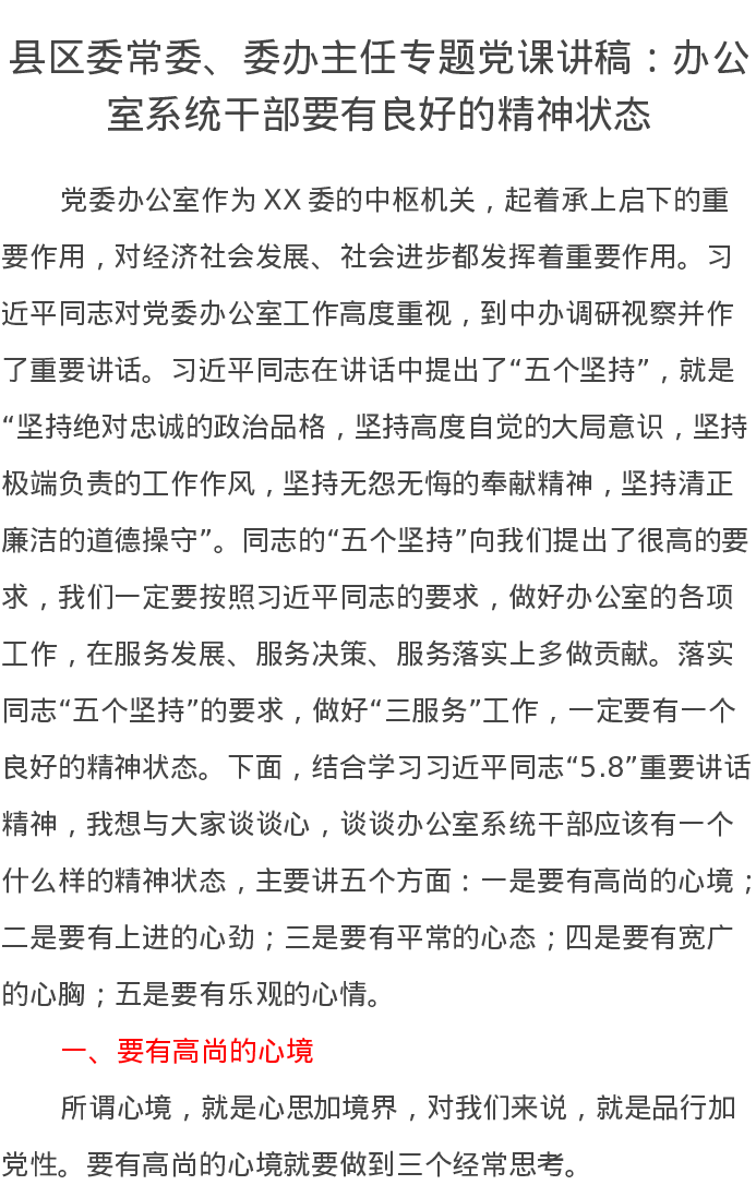县区委常委、委办主任专题党课讲稿:办公室系统干部要有良好的精神状态