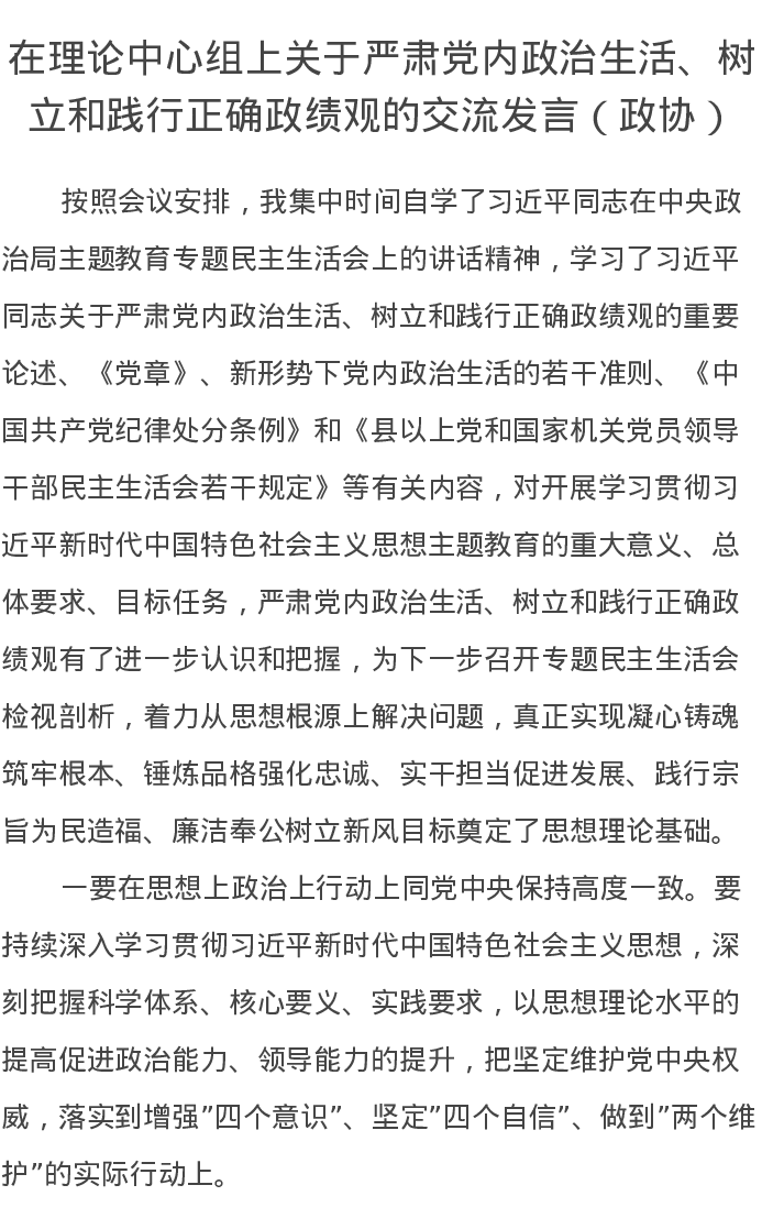 在理论中心组上关于严肃党内政治生活、树立和践行正确政绩观的交流发言(政协)