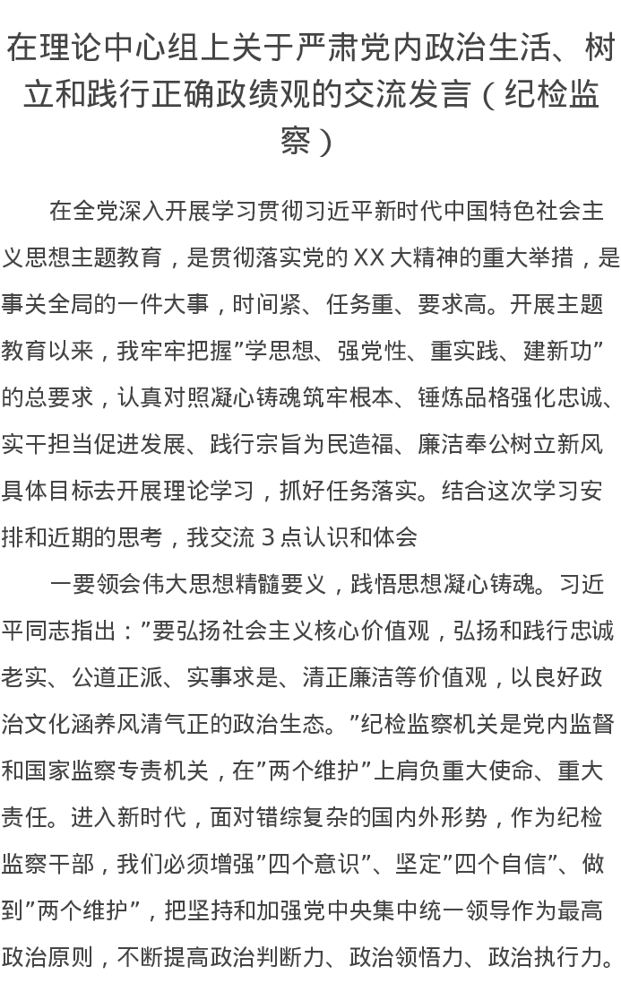 在理论中心组上关于严肃党内政治生活、树立和践行正确政绩观的交流发言(纪检监察)