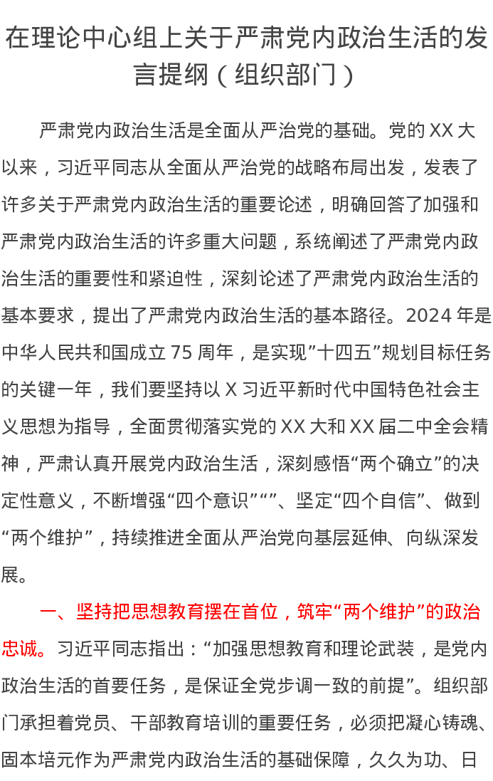 在理论中心组上关于严肃党内政治生活的发言提纲(组织部门)