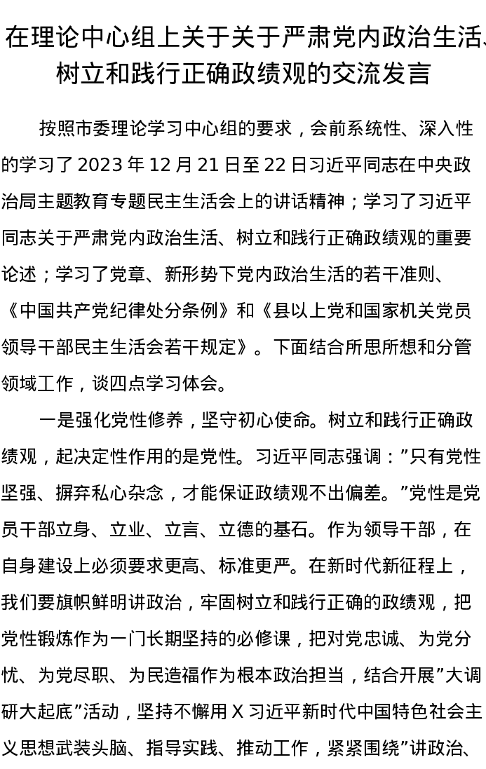 在理论中心组上关于关于严肃党内政治生活、树立和践行正确政绩观的交流发言