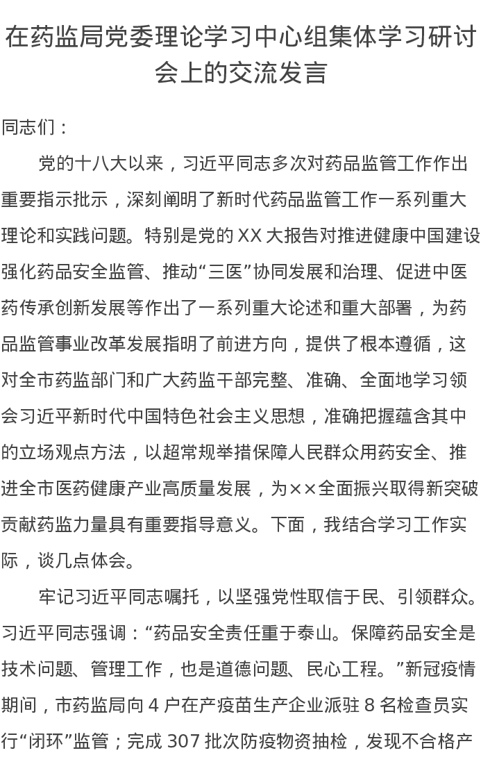 在药监局党委理论学习中心组集体学习研讨会上的交流发言