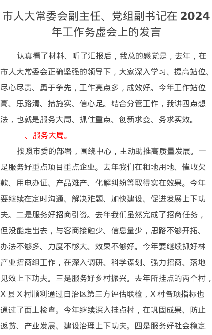 市人大常委会副主任、党组副书记在2024年工作务虚会上的发言