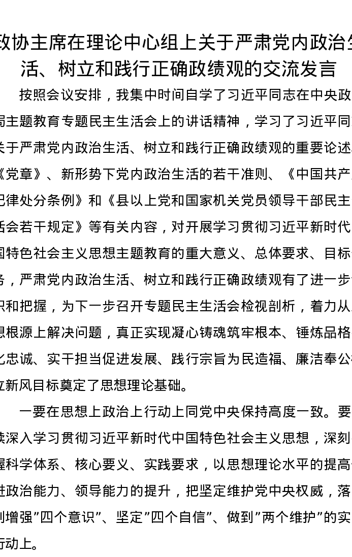 政协主席在理论中心组上关于严肃党内政治生活、树立和践行正确政绩观的交流发言