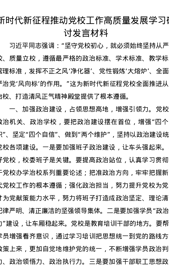 新时代新征程推动党校工作高质量发展学习研讨发言材料