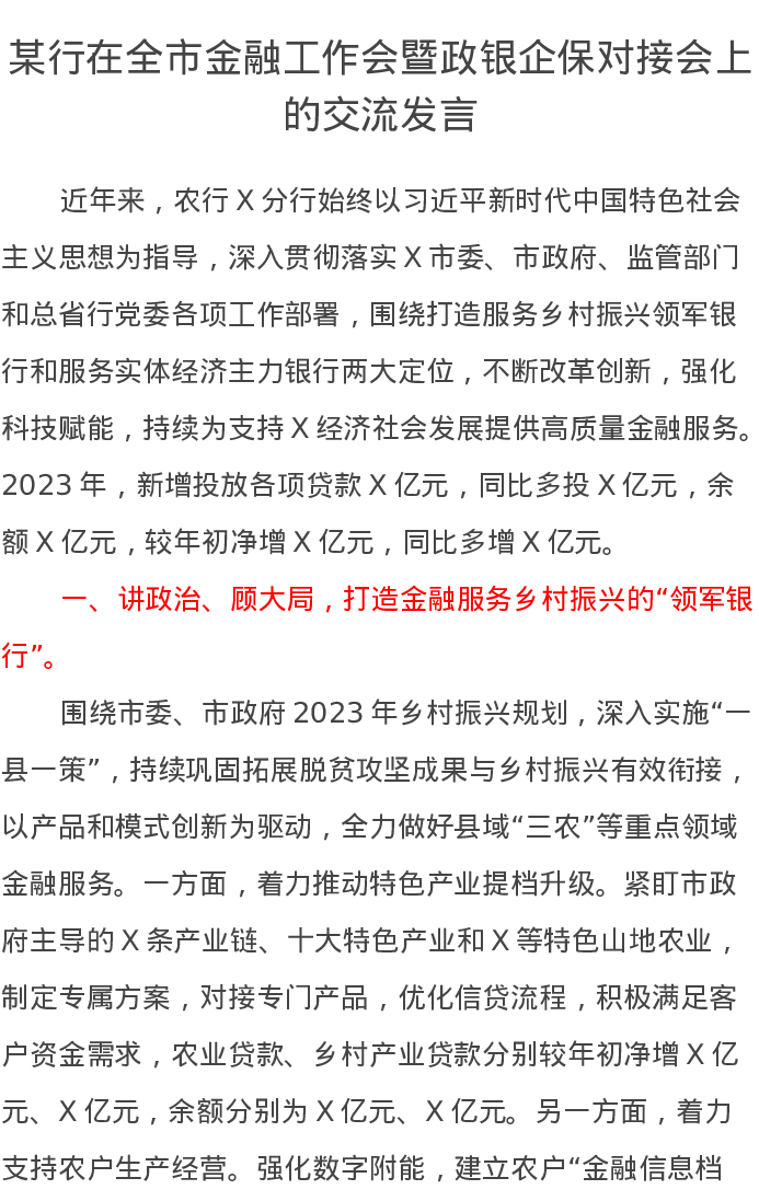 某行在全市金融工作会暨政银企保对接会上的交流发言