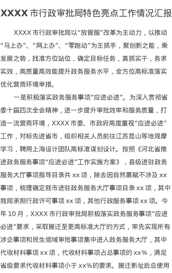 XXXX市行政审批局特色亮点工作情况汇报