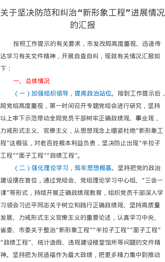 关于坚决防范和纠治“新形象工程”进展情况的汇报