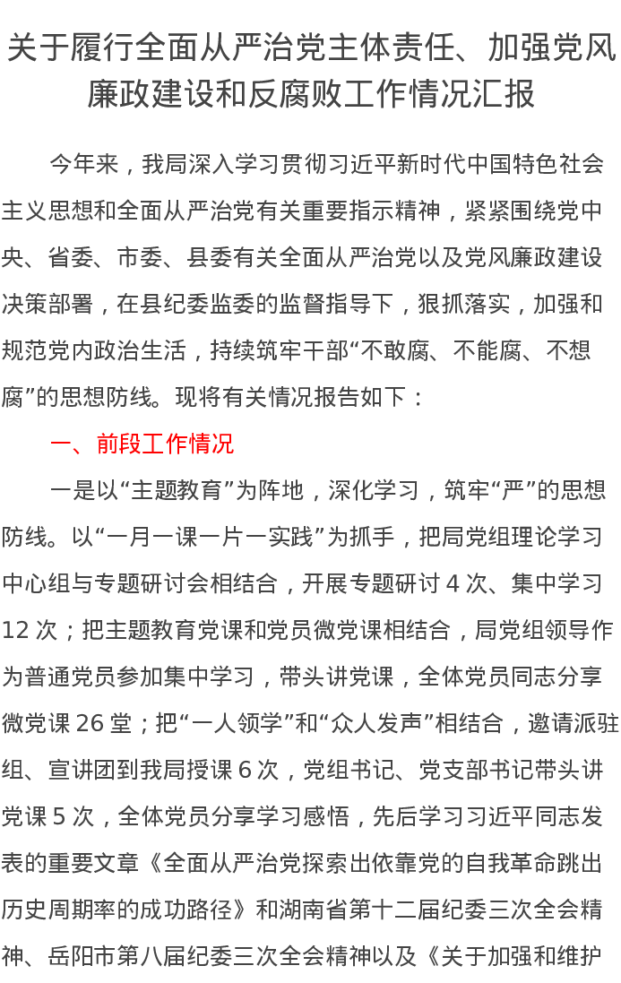 关于履行全面从严治党主体责任、加强党风廉政建设和反腐败工作情况汇报