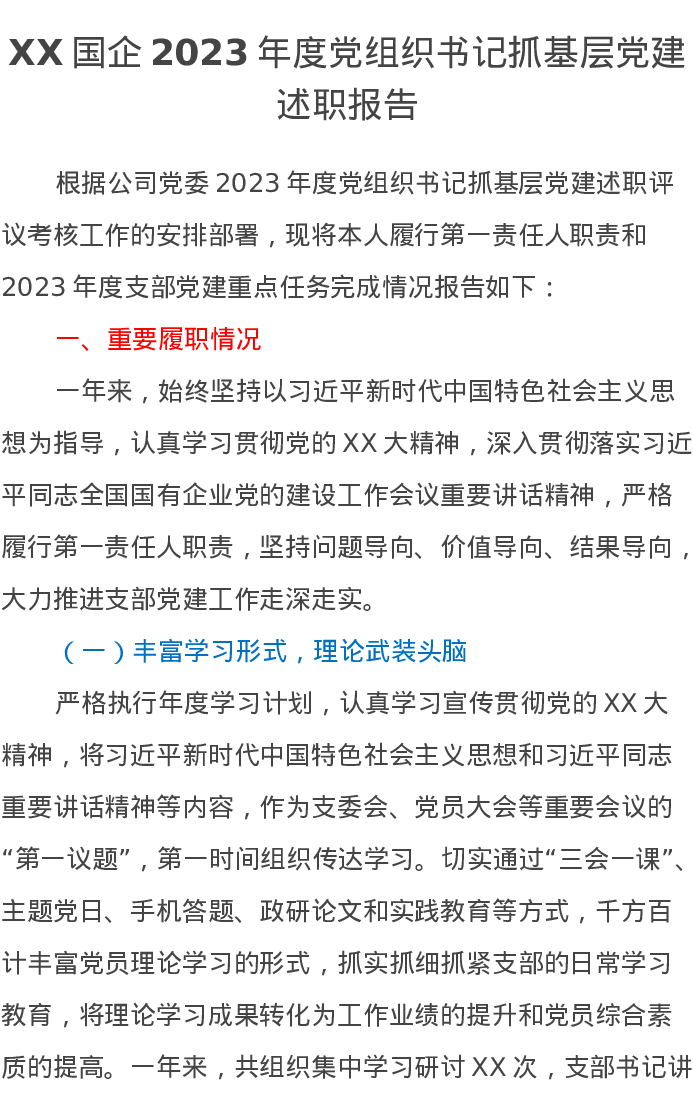 XX国企2023年度党组织书记抓基层党建述职报告